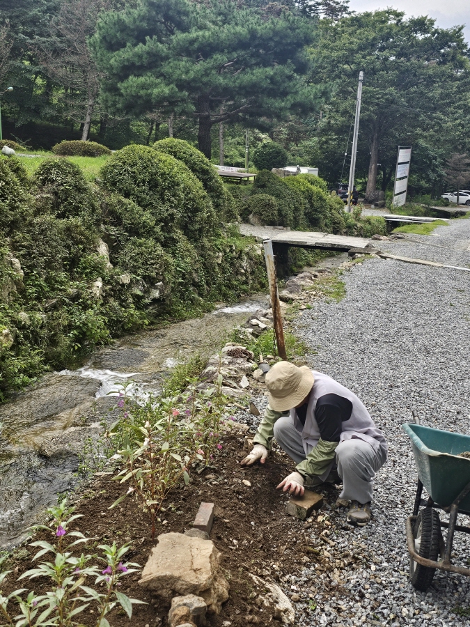 봉숭아 꽃 밭을 정리 하는 광혜스님